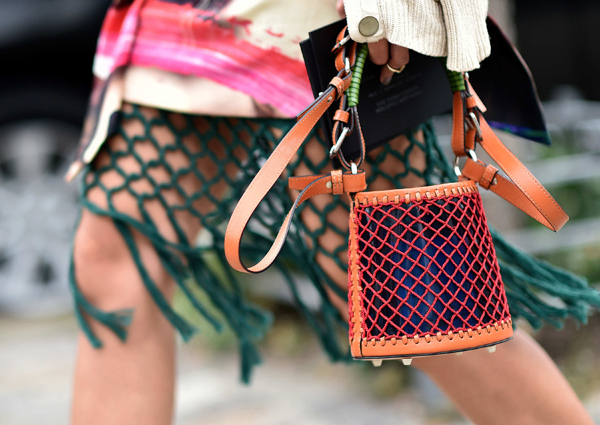 Kenzo漂亮的手包有很多,漂亮的水桶包也有很多,但是像Kenzo这款编织的小水桶还是相当抢镜的。