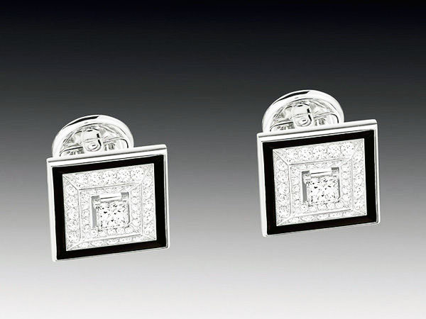 Charleston 袖扣,18K白金镶嵌162颗总重2克拉的明亮式切割钻石,2颗公主式切割钻石以及雕刻玛瑙。